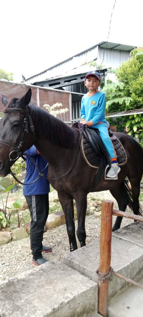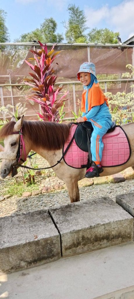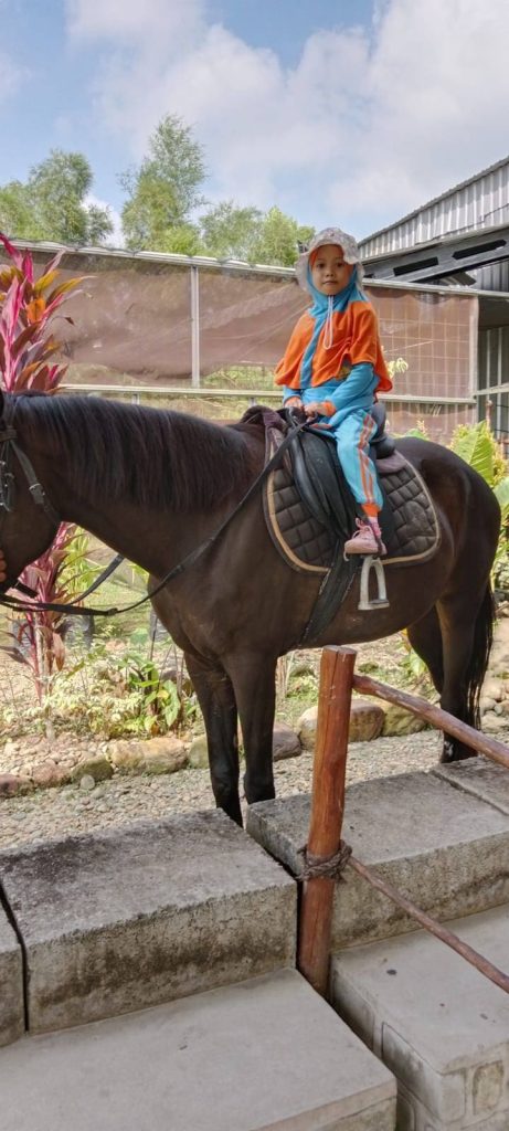 Sesampainya di Coach Aldo, kami makan snack untuk mengisi tenaga. Selanjutnya baru Ananda secara bergantian menaiki kuda dan latihan memanah.